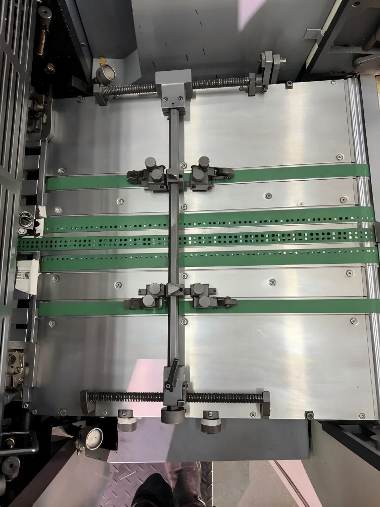 9) Pressil on pidev paberi etteandesüsteem, mis on kokku pandud vaakum-imemispaberi söötmislaua külge, millele on paigaldatud kolm pöörlevat paberi transportimise linti. Selline paberi transpordisüsteem suudab usaldusväärselt transportida erinevat tüüpi laia paksusega pabereid.